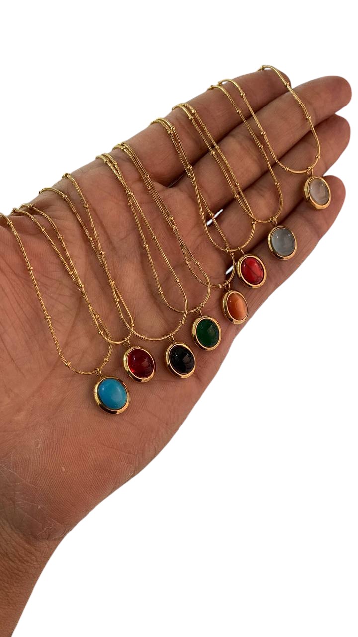 - الإطار الذهبي.. يلفت النظر فوراً: الإطار الذهبي حول الحجر مو بس ديكور. هو مثل “بؤرة” تجذب العين مباشرة للون اللي اخترتيه. بتصير قلادتك هي النجمة اللي تضوي بصدق. هو تركيز هادئ بس قوي.