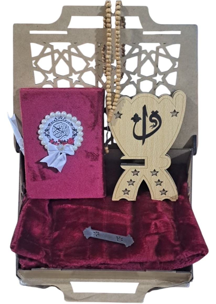 كل طقم يأتي في صندوق خشبي أنيق. الصندوق مزخرف بنقوش إسلامية (الزخرفة الهندسية في خلفية الصور). هكذا يكون الطقم جاهزاً للإهداء بمجرد وصوله. يتضمن طقم مصحف وسجادة صلاة العناصر الأساسية التالية:
